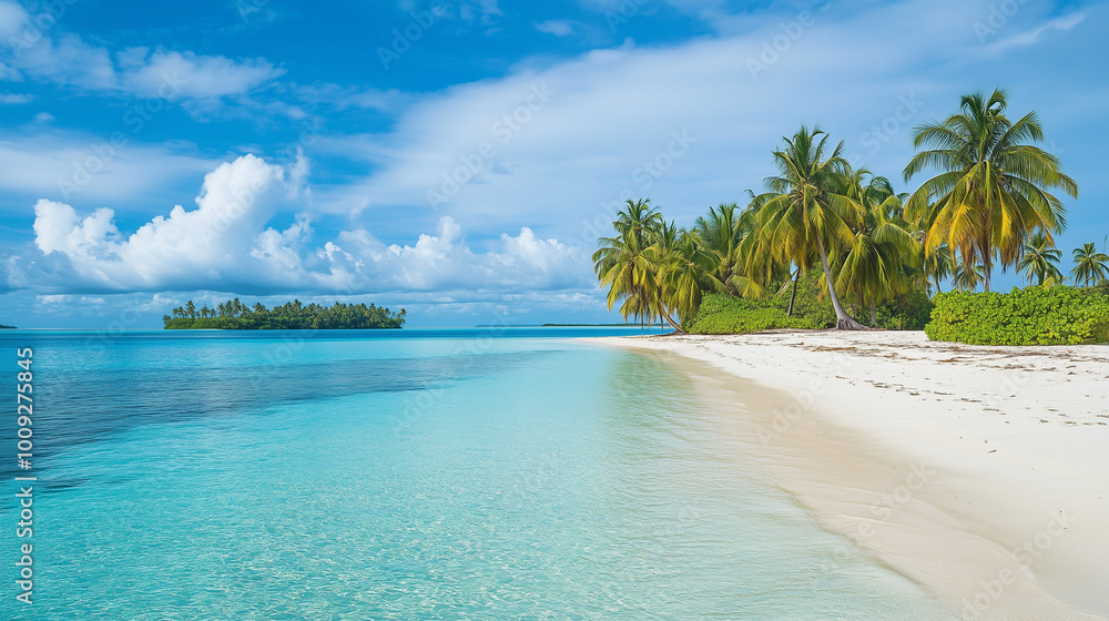 Fototapety Plaża - Tropikalna plaża o złotym piasku jest otoczona bujną roślinnością i ożywczym szumem fal, które... #1009275845