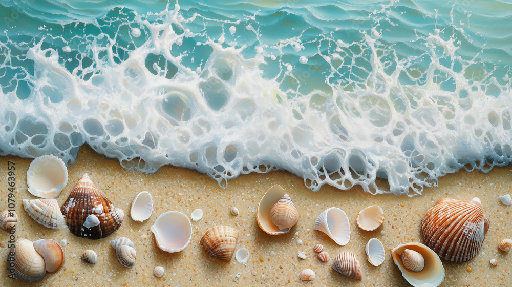 Fototapety Plaża - Muszle leżą na piaszczystej plaży, tuż przy brzegu, gdzie delikatna, spieniona fala dociera do... #1079463957