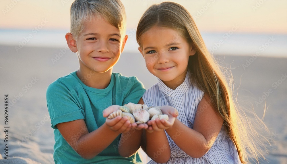 Fototapety Plaża - Dzieci zbierające muszelki na plaży #862968854