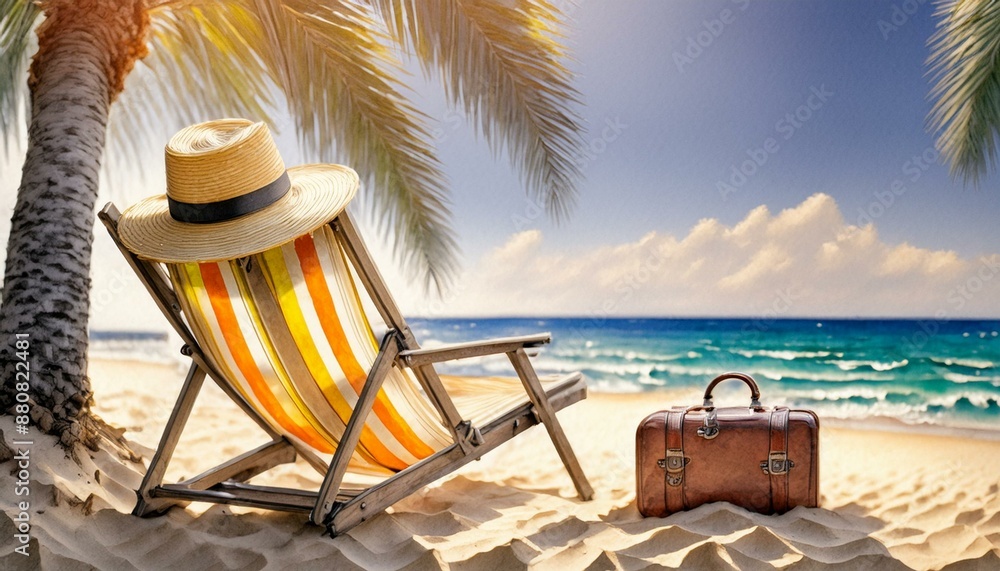 Fototapety Plaża - Leżak, kapelusz i walizka stojąca na plaży pod palmami. W tle morze. Motyw wakacyjnej podróży,... #880822481