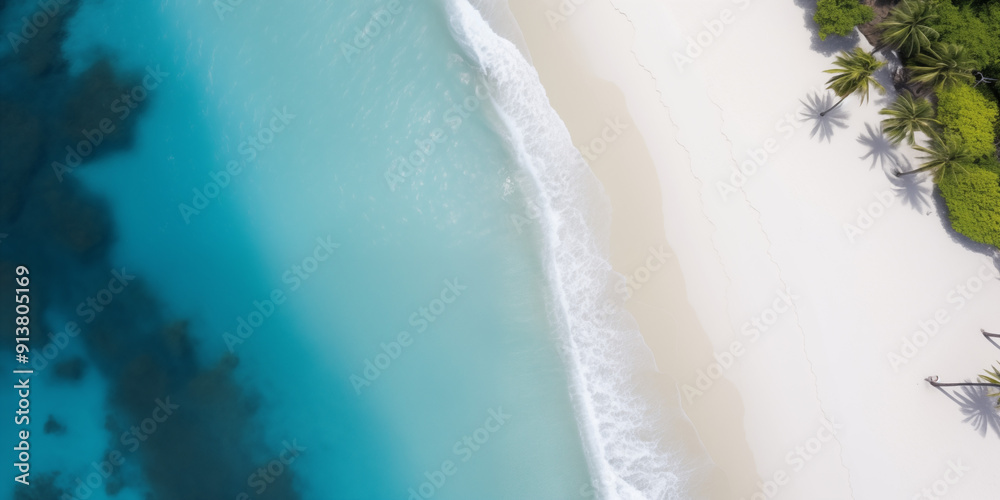 Fototapety Plaża - Przypływ spienionych błękitnych fal morskich na piaszczystej złotej plaży w widoku z lotu ptaka #913805169