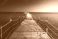 • Drewniany pomost prowadzący do morza, czarno-białe zdjęcie o nostalgicznej atmosferze