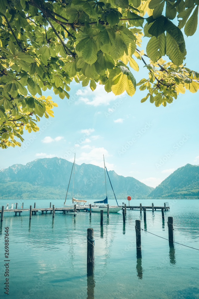 Fototapety Pomost - Pomost z przycumowanymi jachtami, żaglówkami w piękny słoneczny dzień. Błękitne niebo i lekki... #269887646
