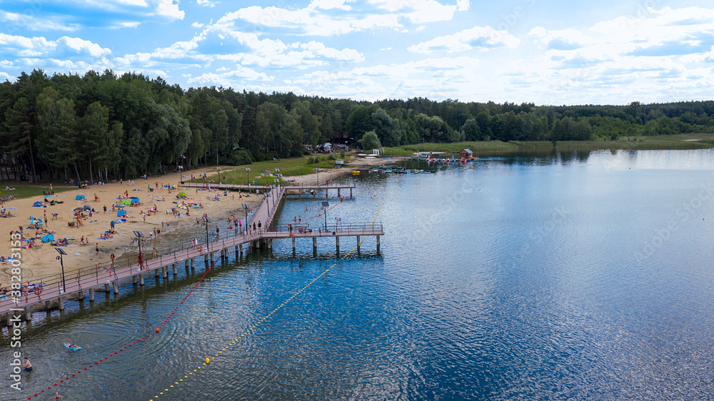 Fototapety Pomost - Widok z lotu ptaka na główną plażę nad jeziorem Głębokie, lubuskie, Polska #382803153