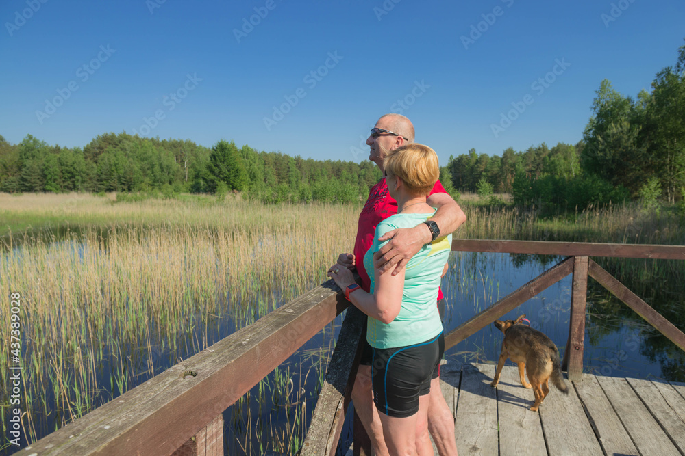 Fototapety Pomost - Letni wypoczynek nad leśnym stawem. #437389028