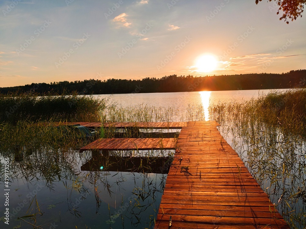 Fototapety Pomost - Zachód słońca nad jeziorem na Mazurach #479173286