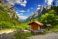 • Drewniany domek Włochy Alpy Dolomity wiosenna sceneria