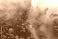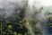 • Aerial view Fog clouds pulling on a spring morning in Switzerland through the forest