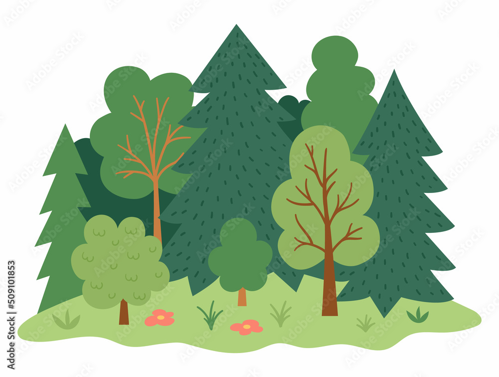 • Vector forest landscape. Environment friendly concept with trees, flowers and bushes. Ecological or outdoor camping illustration. Cute earth day scene with plants.