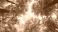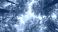 • Trees in forest from below, green tops of trees, blue sky background