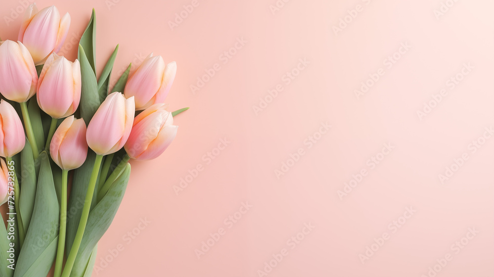 • Kwiatowe brzoskwiniowe minimalistyczne tło na życzenia z okazji Dnia Kobiet, Dnia Matki, Dnia Babci, Urodzin czy pierwszego dnia wiosny z tulipanami. Szablon na baner lub mockup.