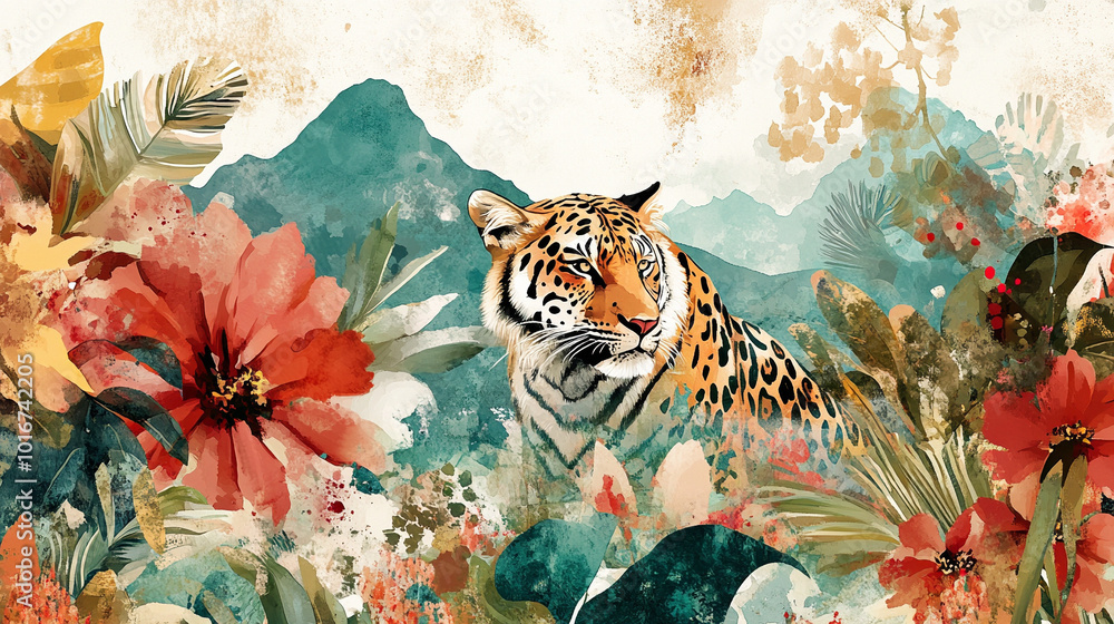 Fototapeta Trendy - Pastelowa tekstura, tygrys i abstrakcyjne kwiaty, tło dla projektu generative ai #1016742205
