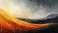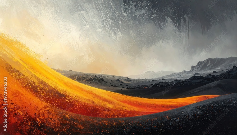 • Dramatyczny krajobraz wulkaniczny z gorącą lawą spływającą po ciemnych zboczach pod zachmurzonym niebem pełnym popiołu w artystycznym ujęciu.