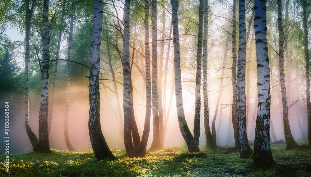 Fototapeta Trendy - Brzozowy lasek na wiosnę o wschodzie słońca we mgle, tapeta generative ai #903668864