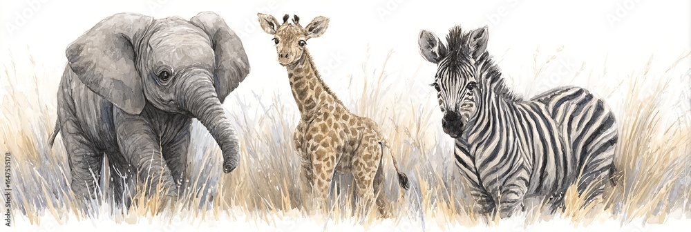 Fototapety Trendy - AKWARELOWE ILUSTRACJE MŁODYCH ZWIERZĄT AFRYKAŃSKICH: SŁOŃ, ŻYRAFA, ZEBRA #1647535178
