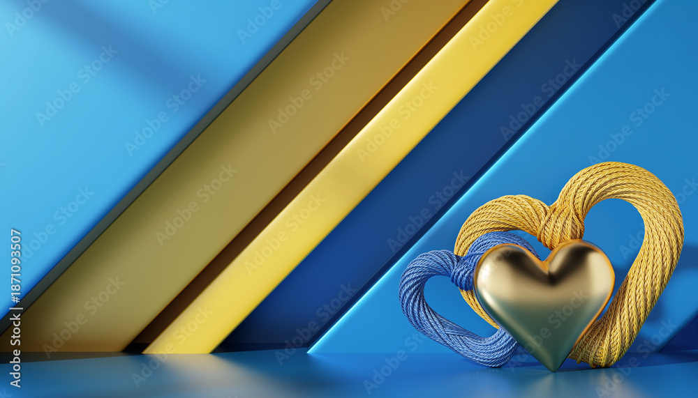 Fototapety Trendy - Serce walentynkowe w odcieniach żółtego i złota na niebiesko żółtym tle. Symbole dnia zakochanych. #1871093507
