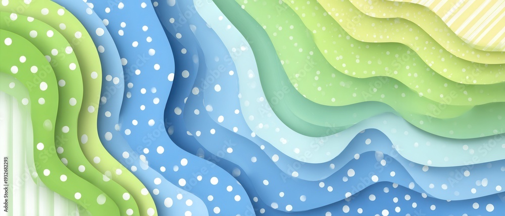 • Abstrakcyjne tło z kolorowymi falistymi warstwami papieru w odcieniach zieleni i błękitu z białymi kropkami przypominającymi padający śnieg.