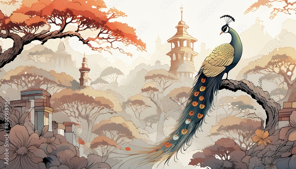• Kolorowe pawie siedzące na gałęzi drzewa. W tle ogród. Orientalna, egzotyczna tapeta, grafika
