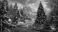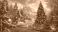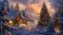 • zimowa sceneria domu oraz przybranej ozdobami choinki jako karta na świąteczne życzenia