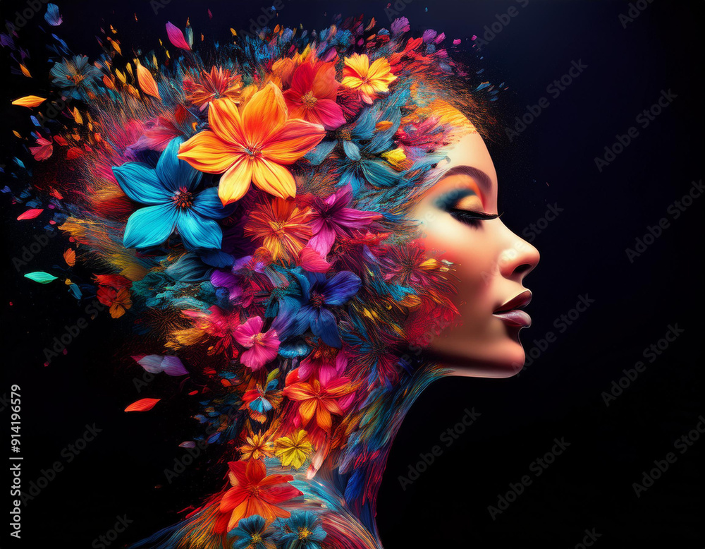 Fototapety Trendy - Kobieta z profilu na czarnym tle, w kwiatach, fantazyjny portret tapeta generative ai #914196579