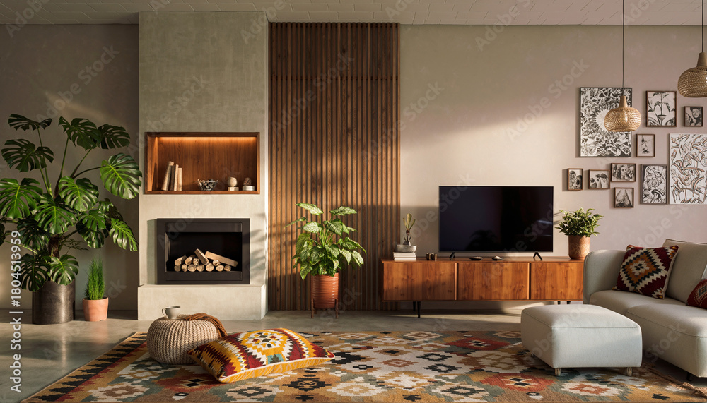 Fototapety Drewno - Nowoczesne wnętrze salonu z elementami drewnianymi oraz tkaninami w stylu etnicznym #1804513959