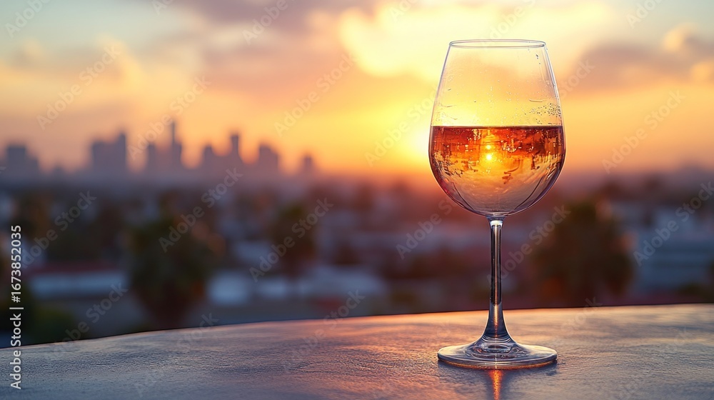 Fototapeta do korytarza - Sunset wine glass city rooftop romance #1673852035
