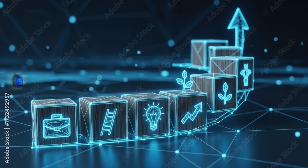 • The concept of planning and growth shown by arranging blocks for a career journey.