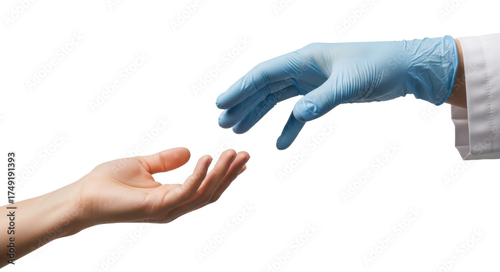 • Doctor's gloved hand reaches for a bare hand, symbolizing care and connection. Isolated on transparent background, png