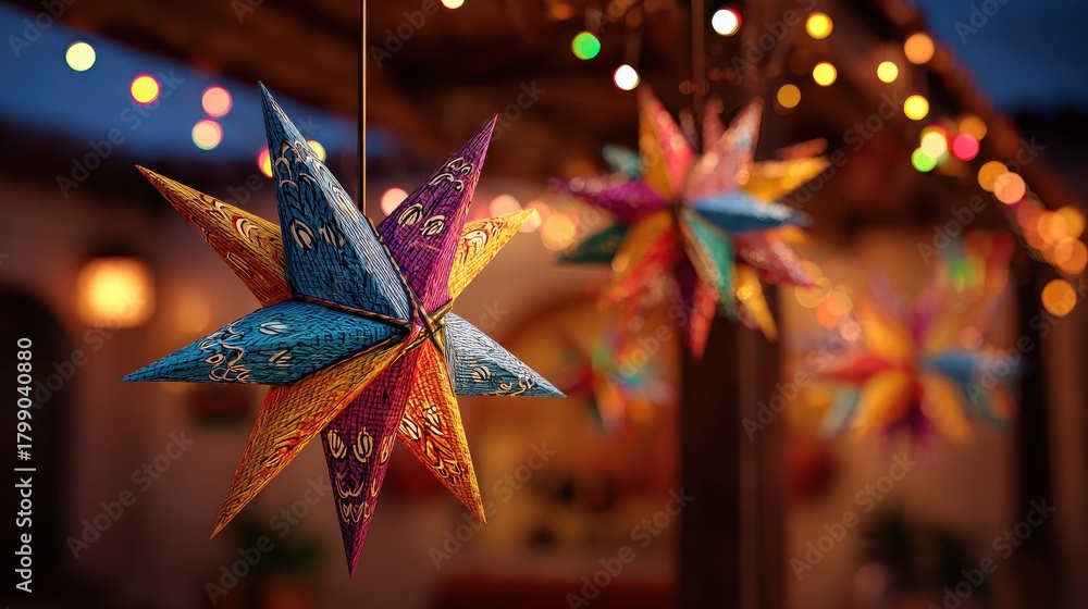 • vibrant las posadas celebration decoration featuring a traditional star piñata hanging against a warm festive lights background showcasing colorful hispanic holiday decor and joyful mexican christmas