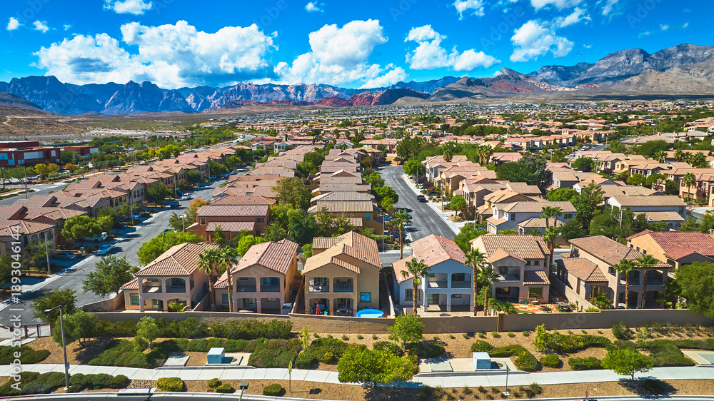 Fototapeta do korytarza - Aerial Las Vegas Residential Neighborhood Red Rock Mountain Summer View #1893046144