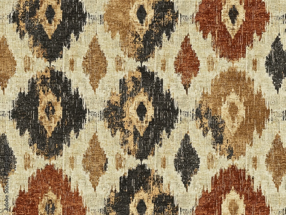 • Abstract textile with a decorative pattern of diamond-like shapes and floral-like features in brown, beige, and black tones.
