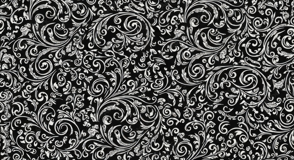 • Intricate white floral swirls on a black background a detailed elegant pattern