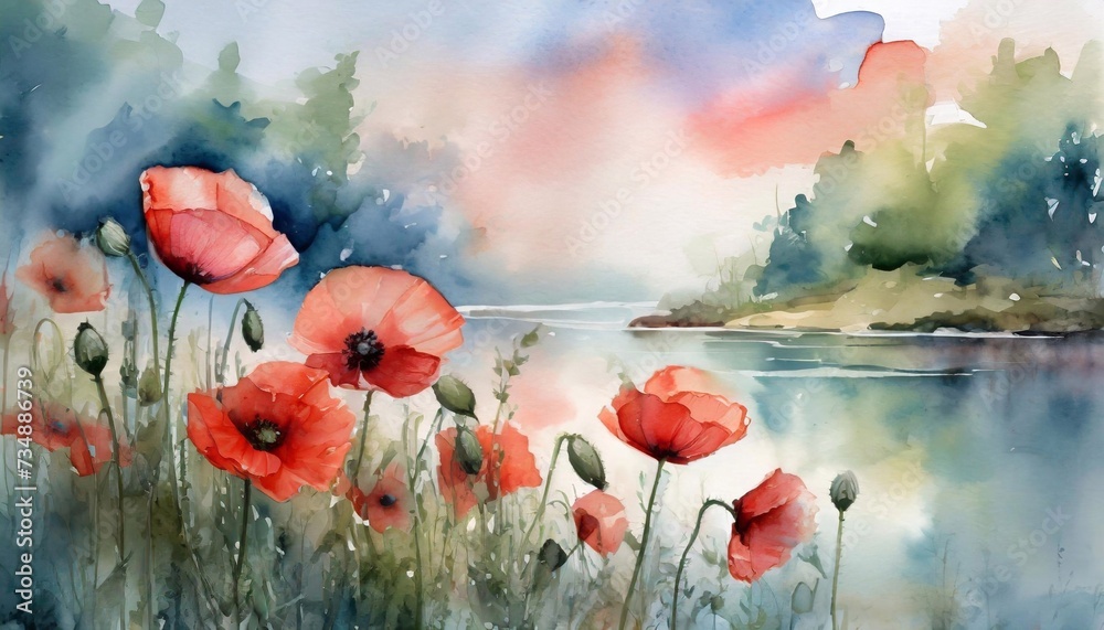 kwiaty - Malowane kwiaty Maków nad brzegiem jeziora, akwarela, tapeta, dekoracja. Generative AI #734886739