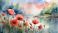 • Malowane kwiaty Maków nad brzegiem jeziora, akwarela, tapeta, dekoracja. Generative AI