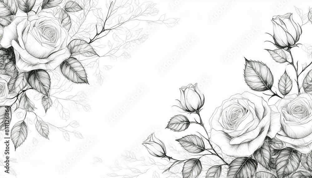 kwiaty - Gałązki róż na białym tle. Rysunek szkic. Zaproszenie, tło #811126864
