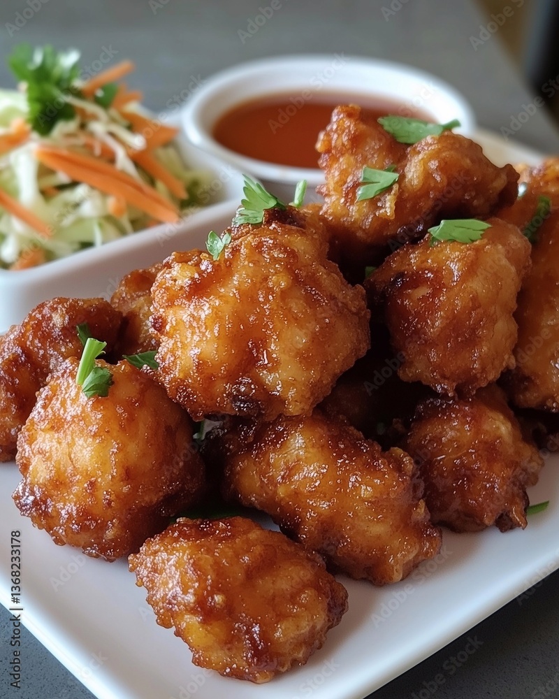 • The world's most popular chicken dish: crispy, golden fried chicken served on a pristine white plate.