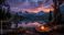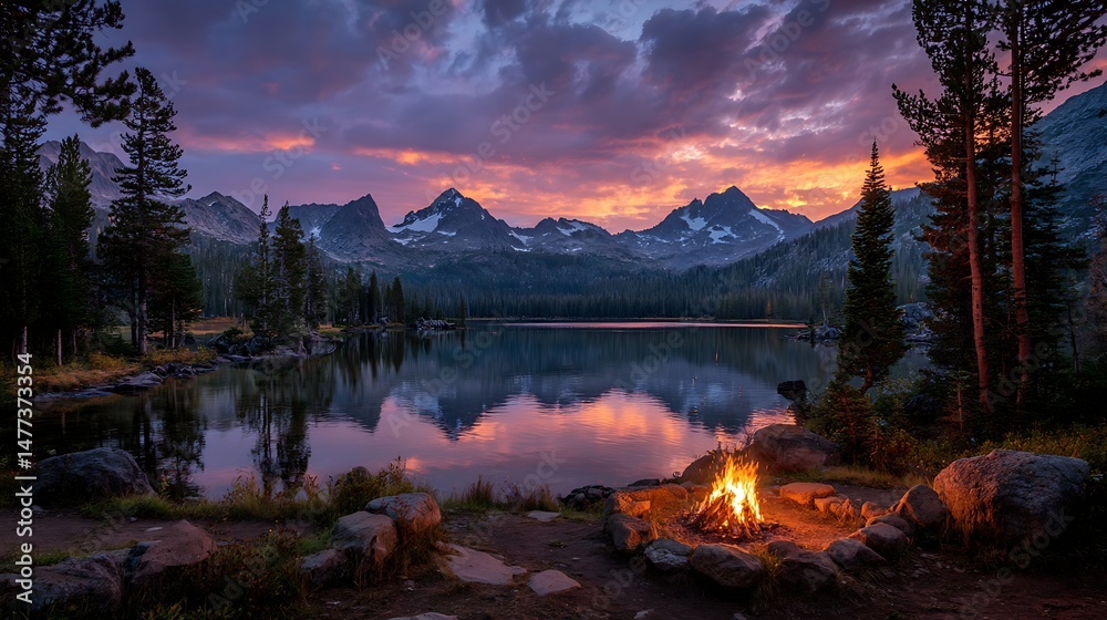 • Twilight campfire at high snow capped mountains in most beautiful multi colored sky in mountain lake landscape