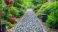 Piękna ścieżka ogrodowa z brukowanym chodnikiem, otoczona bujną roślinnością i kwiatami w donicach.