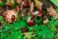 • Kasztany opadłe z kasztanowca, leżące wśród opadłych, brązowych liści i zielonych roślin.