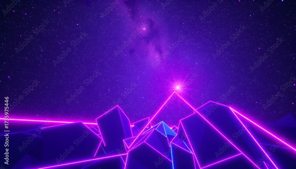 • A vibrant, neon-lit landscape featuring geometric mountains under a starry, purple-hued night sky with a prominent nebula.