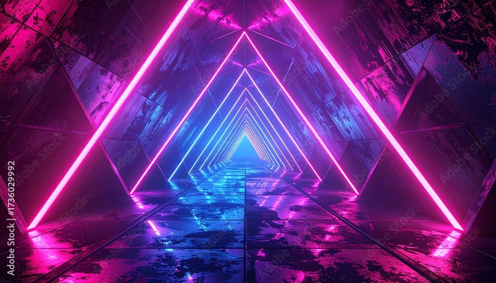 • Abstract triangular patterns forming a futuristic tunnel, glowing neon edges