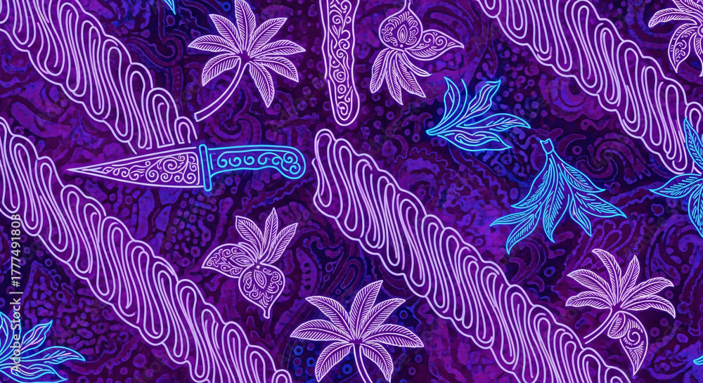 • Intricate Batik Fabric Pattern with Floral Motifs and a Dagger Design in Purple Hues