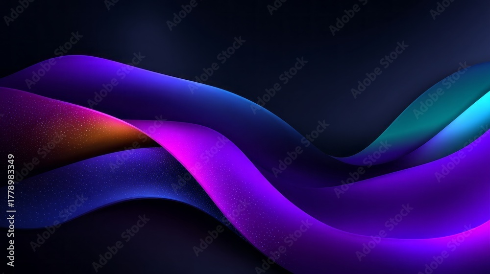 • Colors blend and flow in a mesmerizing wavy pattern, showcasing vibrant shades of violet, purple, and green. This artwork captures a sense of fluid motion and energy in a dark background