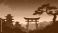 • Vibrant Japanese landscape featuring traditional pagodas and a torii gate silhouetted against a stunning purple and pink gradient sky, evoking serene ancient beauty