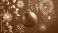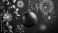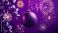A purple Christmas bauble with ornate design hangs against a background of fireworks and foliage