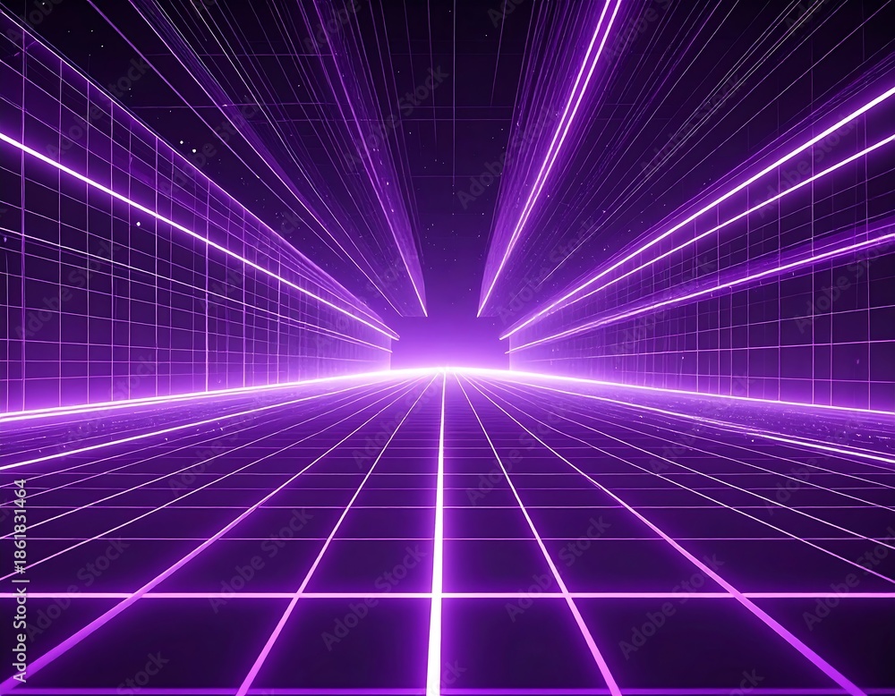 • Futuristic, geometric perspective of luminous violet lines forming a grid