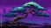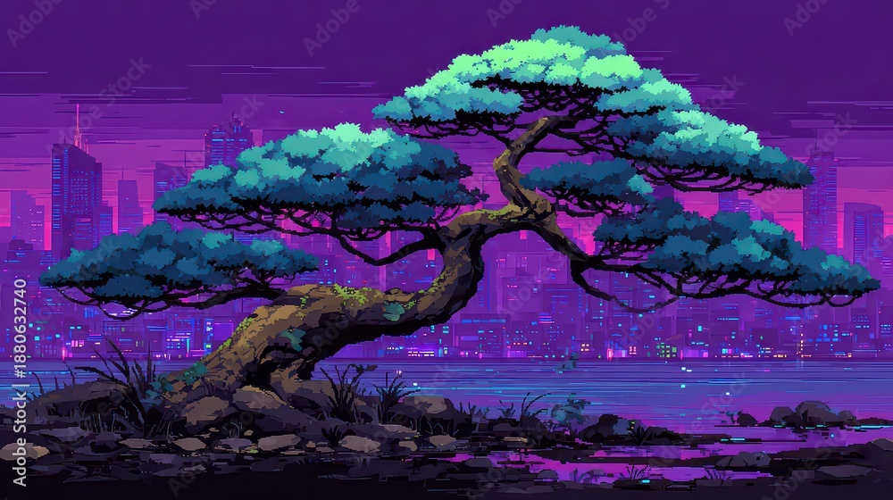 • Pixelated Bonsai Tree Overlooking Glowing Cityscape in Purple and Teal Hues at Twilight with Detailed Foliage and Textured Landscape