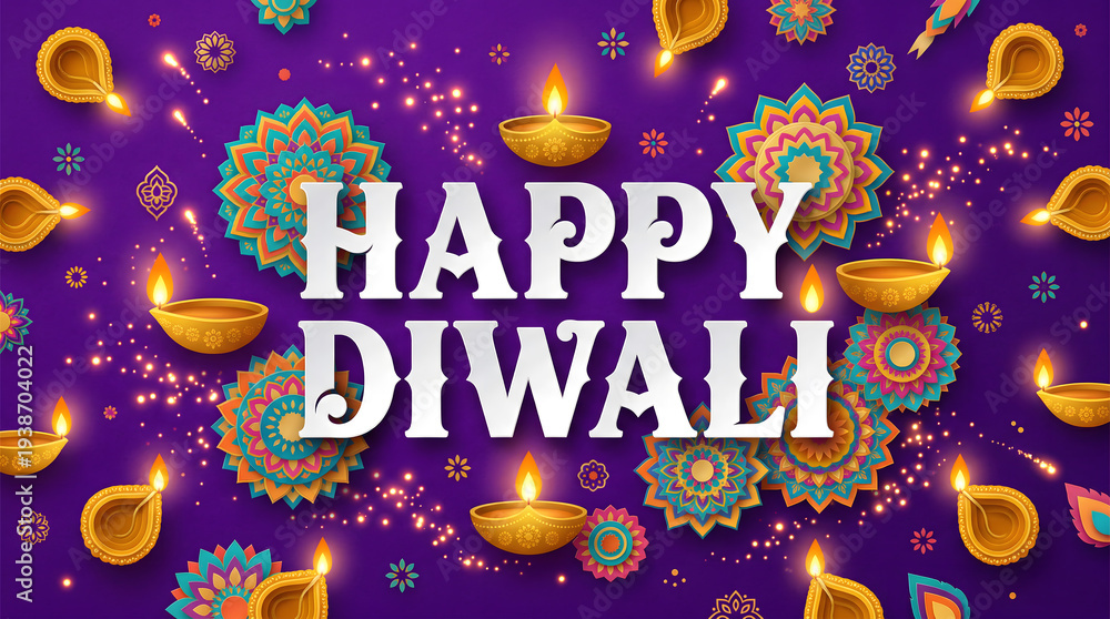 Chabrowy - Happy Diwali 3D Paper Cut Text with Diya Lamps on Violet #1938704022