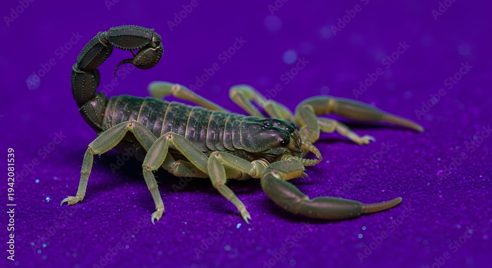 Chabrowy - An up-close perspective of a scorpion on a textured violet surface, showcasing intricate detail... #1942081539