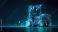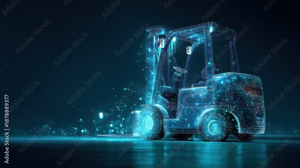 • 3D model of a forklift with glowing lines and particles in a dark space showing digital technology and innovation